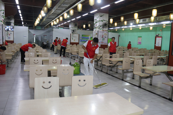 首先進(jìn)行的是公司食堂的清掃清潔。只見志愿者們有的手持抹布,有的揮舞拖把,有的幫忙換水,大家團(tuán)結(jié)協(xié)作分工有序埋頭苦干,對(duì)食堂的打菜窗口、桌椅板凳、地面墻角等處進(jìn)行深入清掃,做到不留衛(wèi)生死角。通過辛勤勞動(dòng),食堂的環(huán)境衛(wèi)生狀況得到改善,面貌煥然一新。