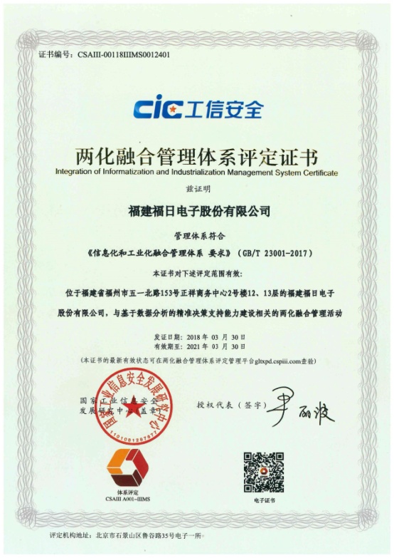 2018年330日,福建福日電子股份有限公司獲得了工信部兩化融合管理體系評定證書。公司20176月啟動兩化融合管理體系貫標,打造信息化環境下的新型能力——基于數據分析的精準決策支持能力,并于20178月列入工信部“2017年兩化融合管理體系貫標試點企業名單。通過本質貫標,公司在福建省電子信息集團系統先行先試,率先通過兩化融合管理體系貫標評定。公司將不斷完善兩化融合管理體系,促進兩化融合建設成果深化應用,提升公司核心競爭力。